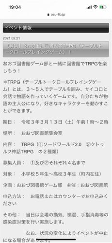 2021年3月13日(土曜) 熊本おおづ図書館さんでTRPG企画を行いました。 https://www.ozu-lib.jp/_m/event/2021/4190/ 格闘系司書 on Twitter: "熊本、おおづ図書館さんでのTRPG企画は無事に終わりましたー。 (´∀`) コロナ対策で1時間という制限がありまし…