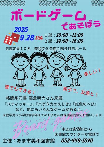 愛知県のあま市美和図書館さんで、ボードゲーム企画をお手伝いしてきましたー。 小さい子が多めでしたが、とても盛り上がって皆さん楽しい時間を過ごされてました。 ボードゲーム体験の様子 告知ポスター なお、なぜかめちゃくちゃ私の言動にウケル小学生の…
